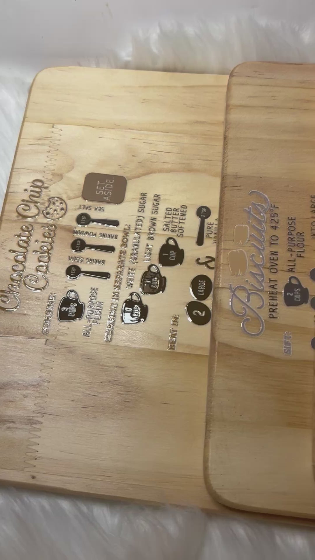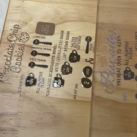 This is a wood cutting board accented with food recipes. This is a great gift to a cook or baker in your life. Our cutting board combo is a limited edition that comes with silicone pot holders/silicone golves and apron. We have the pancake, pumpkin pie, apple pie, biscuits, dinner rolls & chocolate chips recipe available.