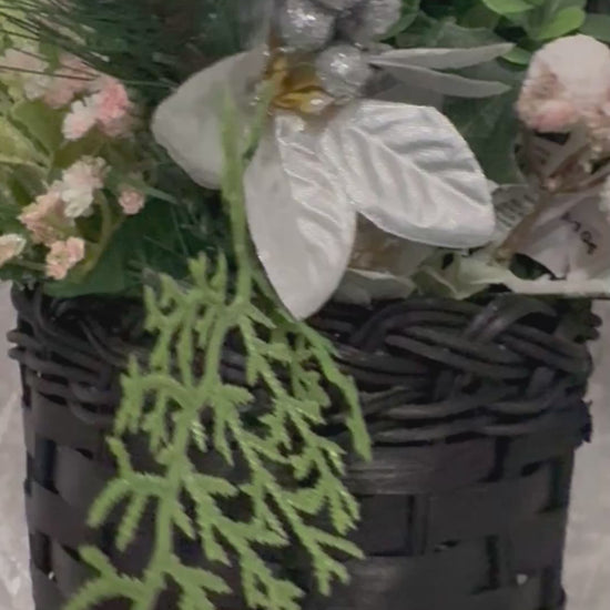 This an elegant floral door basket that will complement your decorations for the upcoming holiday season. This is made of a woven basket filled with florals themed for the holidays. The floral basket speaks volumes of Grace and Elegance. This will make your door smile and welcome your guests with a smile of joy.