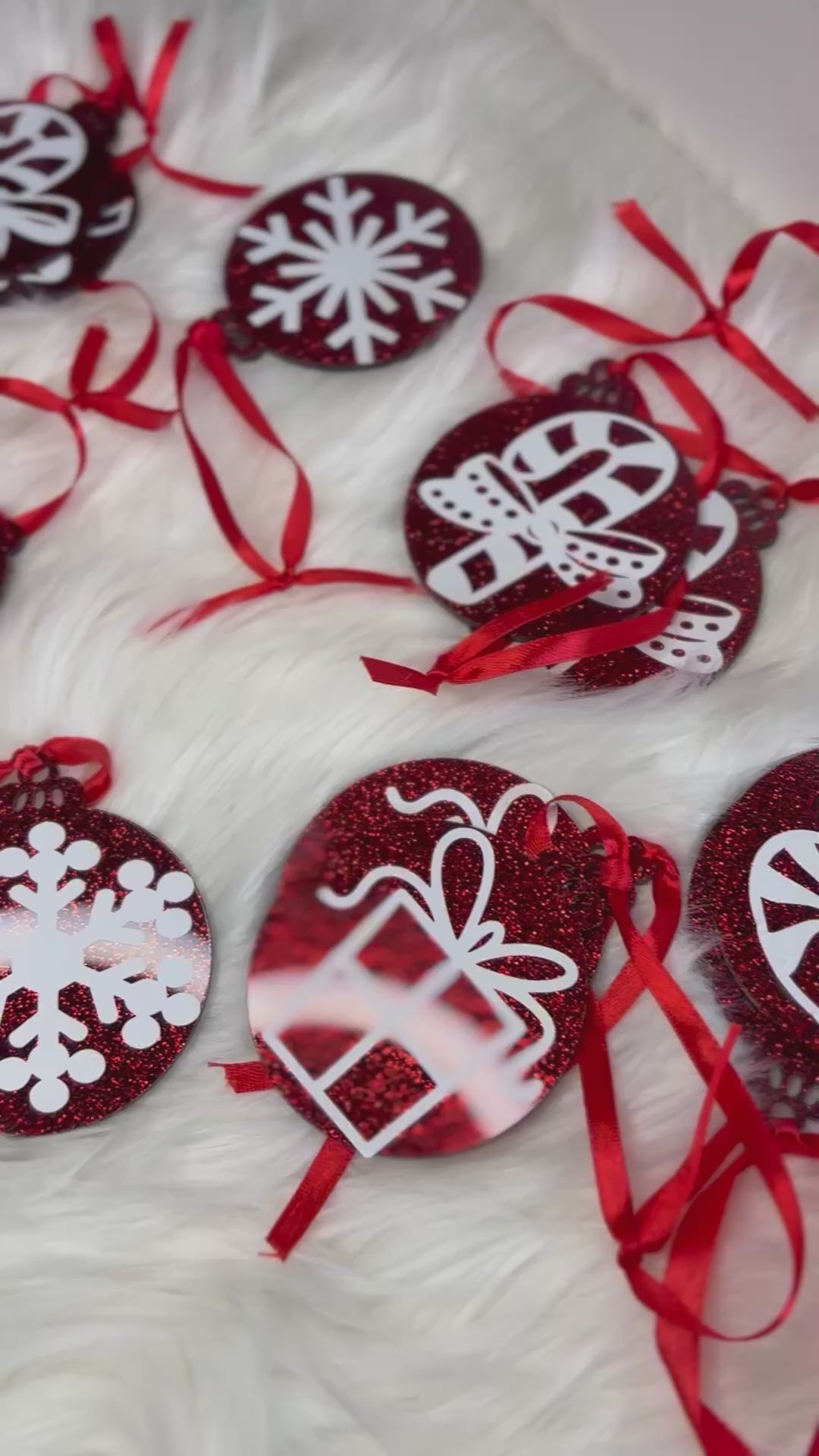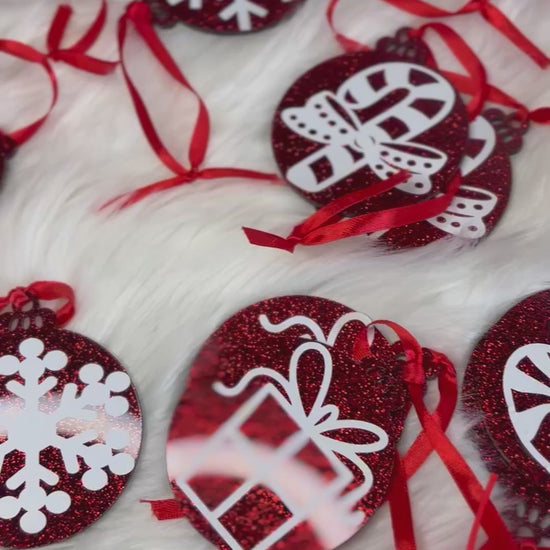 These ornaments are made from acrylic products. These acrylic are accented with vinyl. Perfect for your Christmas tree