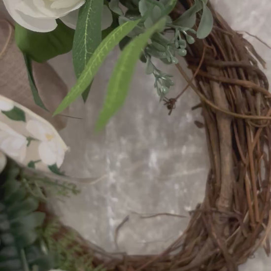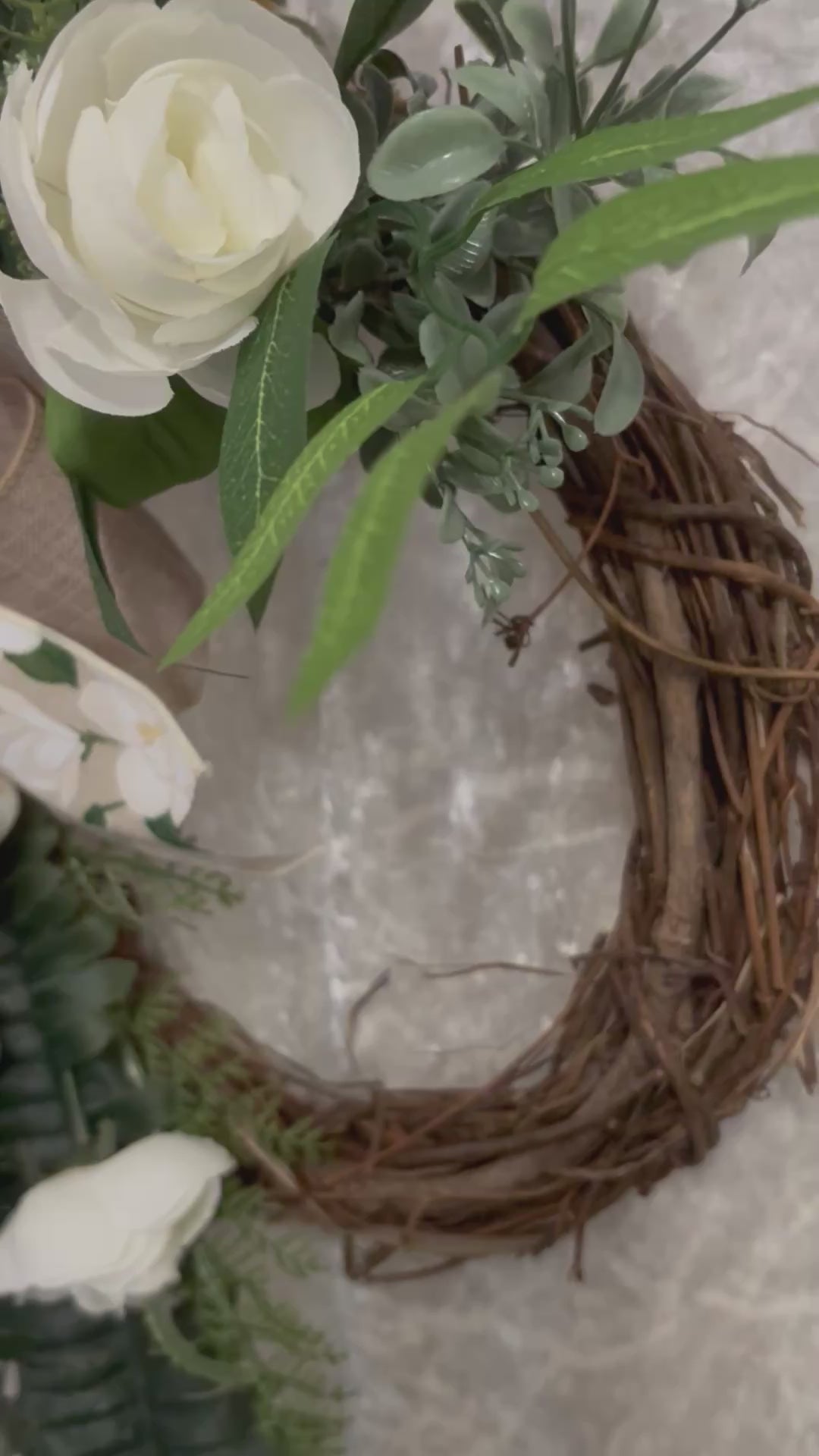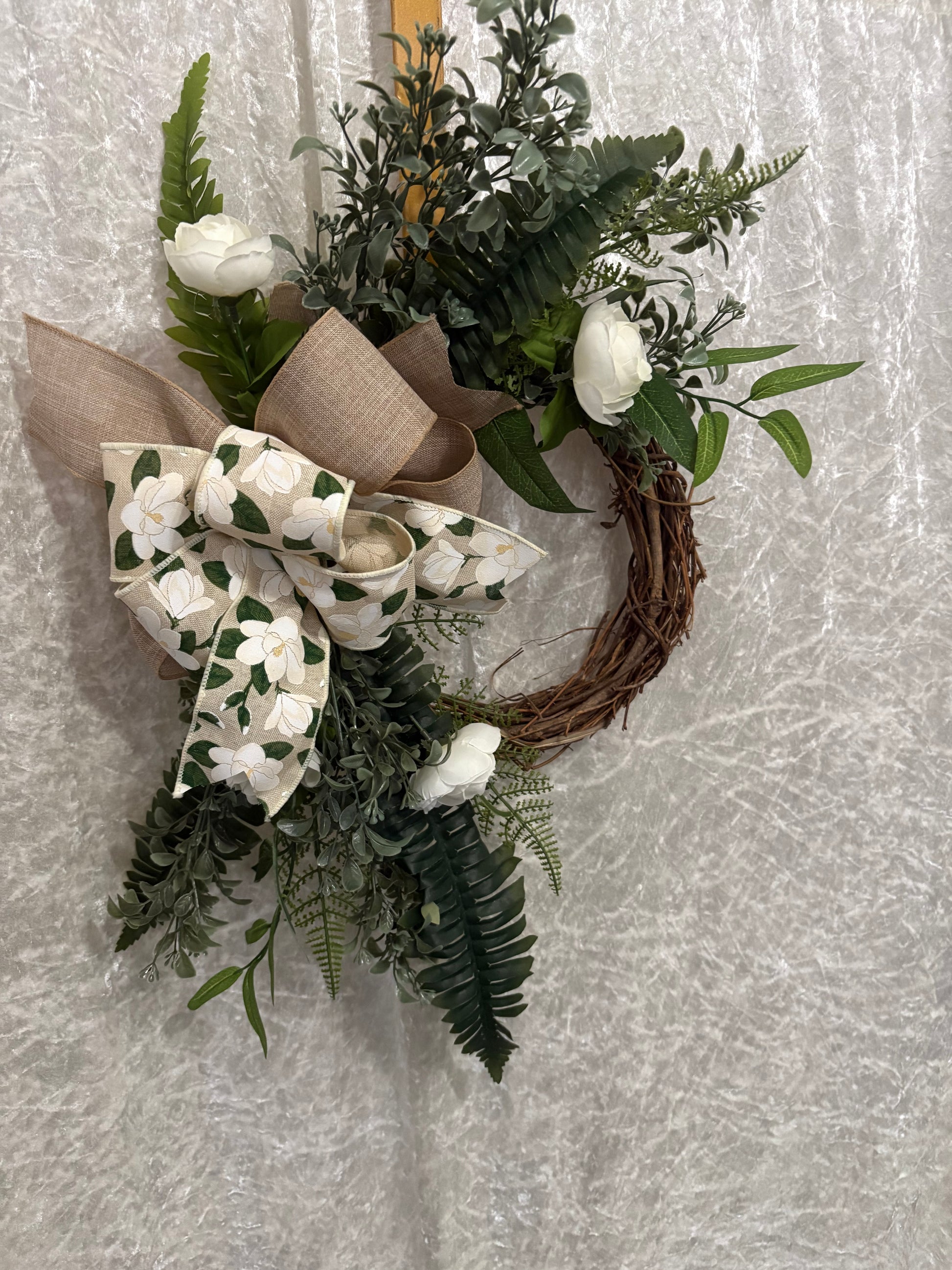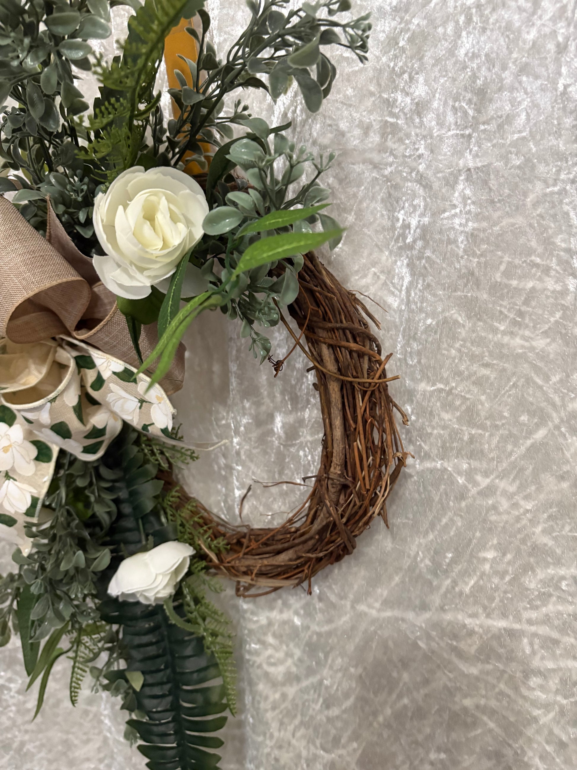 This is a grapevine floral door wreath, great for all season. This is made out of grapevine, florals and ribbons. It’s great for welcoming your guests.