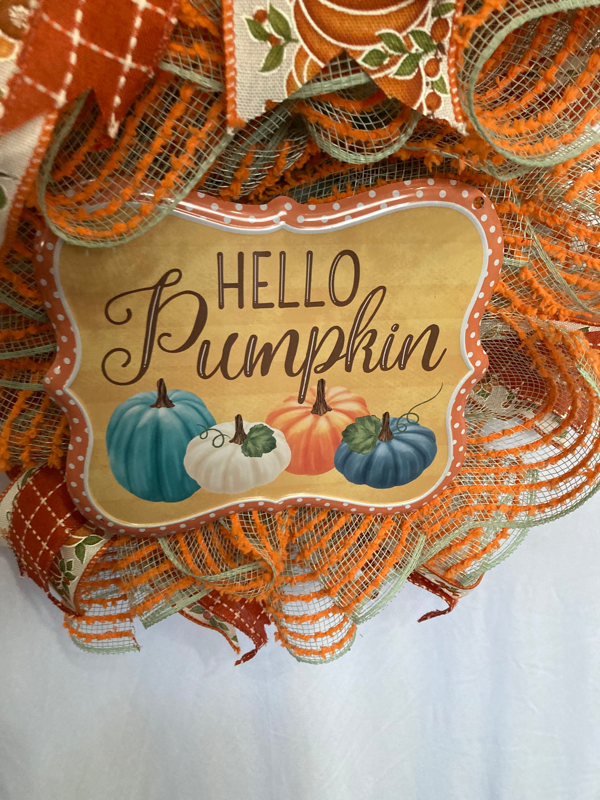 This is a fall wreath perfect for fall decorations. It’s made in fall colours like bright orange and burnt orange. It’s made with deco mesh, ribbons and a wreath sign.