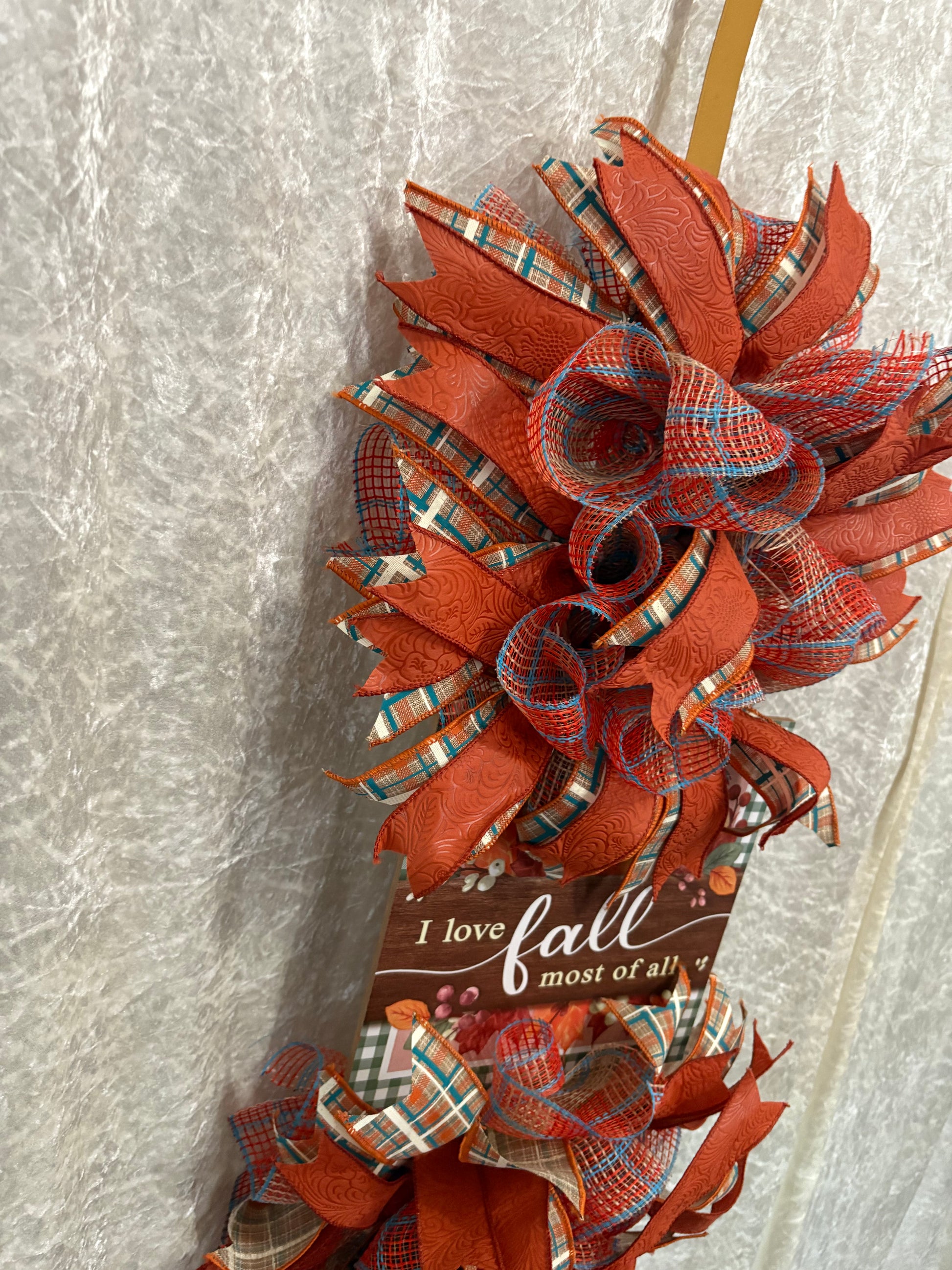 This is a very large fall wreath that looks like a swag wreath. This wreath speaks elegance, it’s made from a striped deco mesh, ribbons, and a wreath sign. It’s in fall colours, orange and burnt orange.